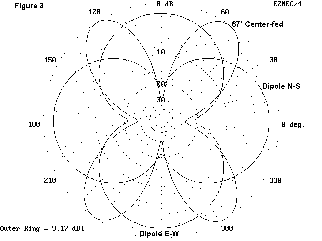 Figure 3 shows the same data for the 67' Zepp, about the length of a 40-meter dipole. There are only 4 lobes for this shorter antenna, but, of course, 4 nulls as well.