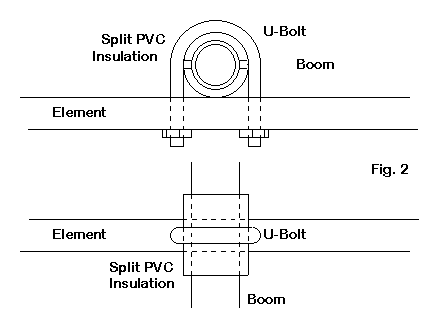 There is a simpler method of mounting insulated elements. It involves a single U-bolt per elements that goes around the boom and through the element. It is best to use a curved plate that matches the element curve as a keeper. Between the U-bolt and the boom is a short section of split gray electrical PVC that acts as an insulator. (The gray PVC used for electrical conduit has the greatest UV resistance and hence will last longer in the sun before going brittle.) The tubing used in this system should be fairly large and should have an interior piece of tubing for reinforcement. Otherwise, the element will break off right at the U-bolt. This system requires even more careful machine work for good alignment and does weaken the element. So use the scheme, outlined in Fig. 2, with caution.