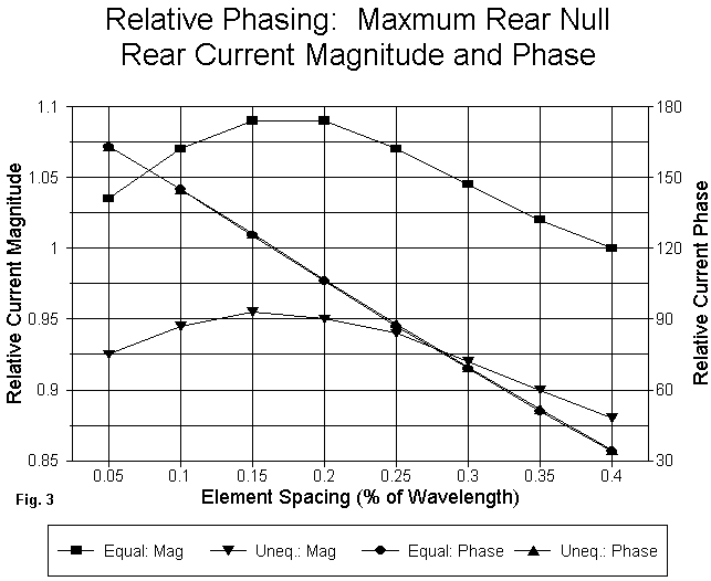One discovery is that for any combination of element lengths and spacings, there will be a specific value of relative current magnitude and phase angle on the rear element that will produce the deep rear null. That set of values will vary if we change the spacing or if we change the length of one or both elements. In other words, there is no general magic number for either how much current, or at what phase angle it is, on the rear element, relative to the forward element.