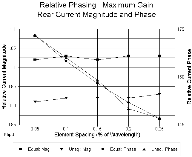 In contrast to the phasing situation, the relative current magnitude required by the rear elements on each of the antennas for maximum gain differs for the two configurations. There is an average of more than 10% difference between the two levels.