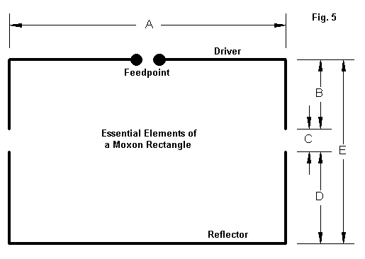 In Fig. 5 we find the general outline of the Moxon rectangle. It is capable of better than 30 dB front-to-back ratio at its design frequency, whether we are talking about a wire version for 80 meters, a tubing version for 20 or 10, or one made from rods for 2 meters or higher. Let's see how the Moxon is able to improve on the Yagi without losing more than a couple of tenths of a dB in gain.