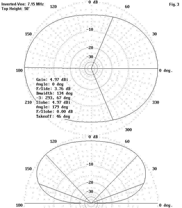 Although this version of the V seems to have a higher gain than its inverted brother, note that the maximum radiation is at a considerably higher angle--almost too high for most skip path communications. Since the elevation pattern is still very broad, communications will still be good, but at a lesser strength than for the inverted-V for most skip paths. However, this antenna is a good candidate for NVIS use.