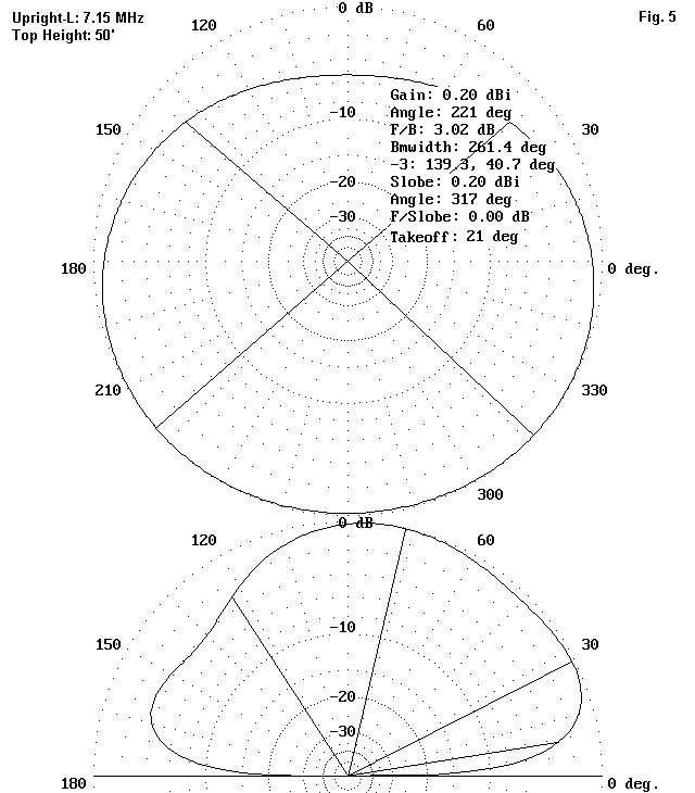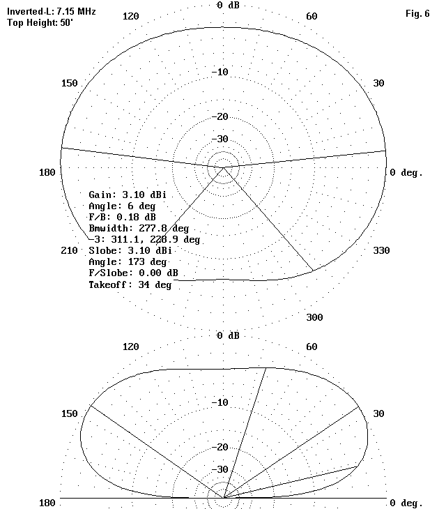 The patterns for this antenna are mostly for reference to show what happens when the horizontal wire is too low for effective radiation. The pattern is something like that of a distorted 1/4 wavelength vertical. However, this antenna shows very much improved performance when the height of the bottom wire is raised to 1/2 wavelength or more above ground. Thus, it tends to work best on 10 meters and above, where it would make a small roof-top antennas or even an antenna to place outside the window of a high-rise apartment building.