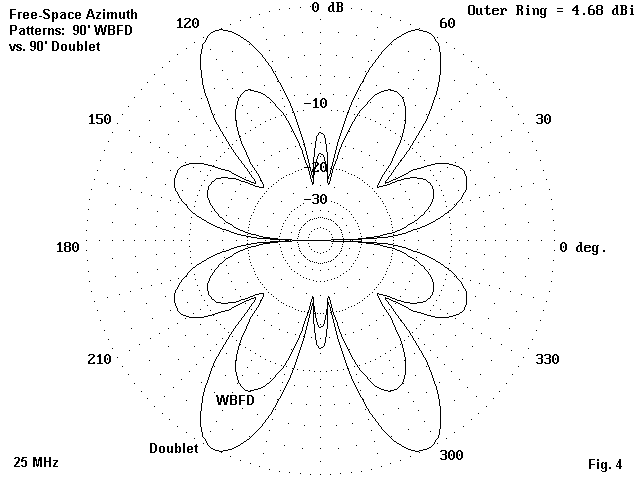Fig. 4 compares the doublet performance with the TWBFD at a higher frequency, 25 Mhz. Once more, the two patterns are virtually identical except for signal strength. Again, the TWBFD signal is about 6 dB weaker than the signal from a single-wire doublet. However, the pattern bears another message besides relative signal strength.