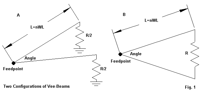 Fig. 1 shows two ways of designing a terminated Vee-beam. One uses terminating resistors that operate like those in the simple longwire. The other uses a cross wire that includes the terminating resistor. Just as in the last episode, the terminating resistor must be a non-inductive element with the ability to dissipate about half of the power supplied to the antenna. Both versions of the Vee-beam use the same principle of operation.