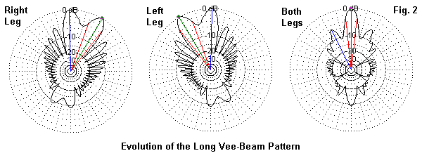 The plots show the patterns for the left and right legs of a planned Vee-beam with 7 wavelength legs. The height of the array is 1 wavelength above average ground. When we combine the two legs, we obtain the pattern at the right. For the leg-lengths that we chose, the main lobes are about 15 degrees off the plane of the wire. By making a Vee with a 30-degree total apex angle, we approach the maximum gain of which the antenna is capable. Obviously, had we selected longer legs, we would have used a narrower apex angle, while shorter legs would have called for a wider angle. If we do not match the angles and the length of the legs, we shall obtain inferior performance.