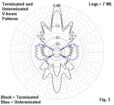 Like the longwire antenna, the Vee-beam is capable of good use with or without its terminating resistors. Fig. 3 gives us comparative patterns for the two versions, using the same legs. Only the presence or absence of the terminating resistors marks the pattern differences. Note that the unterminated Vee-beam has (like the unterminated longwire) about 2 dB more gain. However, it is more truly bi-directional (than the longwire), since the rearward radiation is down by only about 2.5 dB.