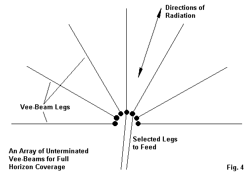 The unterminated Vee-beam is also a useful antenna. It does not require that we obtain suitable terminating resistors (400 Ohms each in the sample antenna). Therefore, only land, wire, and supports stand between us and an array of Vee-beams that can cover the horizon. Fig. 4 shows the required number of Vee-beam legs needed, if we use the 7 wavelength legs and a 30-degree apex angle between legs.