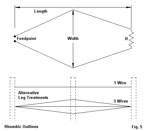 The Rhombic: The terminated Rhombic antenna employs two sets of Vee-beams joined at the outer ends so that the second one forms a distant apex angle at which we install a terminating resistor. Fig. 5 shows the general outlines of a rhombic. Each leg has a pair of main lobes, and the combination of the 4 legs produces a very strong forward lobe.