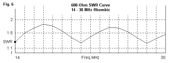 For many year, The ARRL Antenna Book has featured an interesting rhombic design suitable for use on the amateur bands from 20 through 10 meters. It employs a 600-Ohm terminating resistor and is a good match for a 600-Ohm transmission line. Hence, all matching can be done at the shack with a system of impedance-matching transformers or baluns or with an antenna tuner. Fig. 6 provides a 600-Ohm SWR curve across the operating span to show the relatively good match between the terminating resistor and the feedpoint impedance.