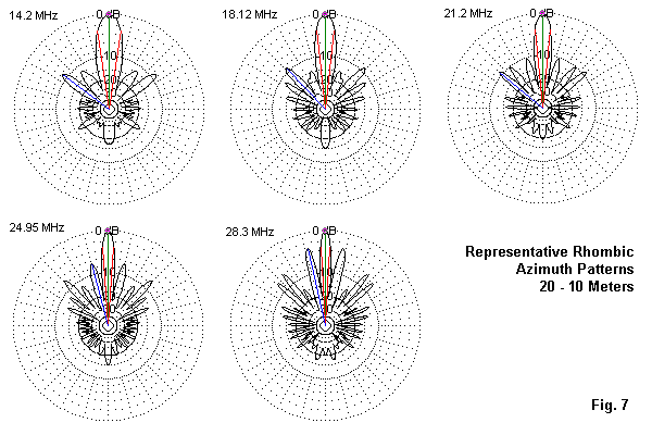 First, the array is fixed in position. We cannot re-aim it easily, if at all. We may combine this restriction with the second limiting factor: the beamwidth of the rhombic is very narrow compared to most wire arrays. The horizontal beamwidth, as measured to the half-power or -3-dB point is narrower than almost any other array. Fig. 7 provides a band-by-band view of the azimuth patterns of the array to provide a sense of how narrow the beamwidth really is.