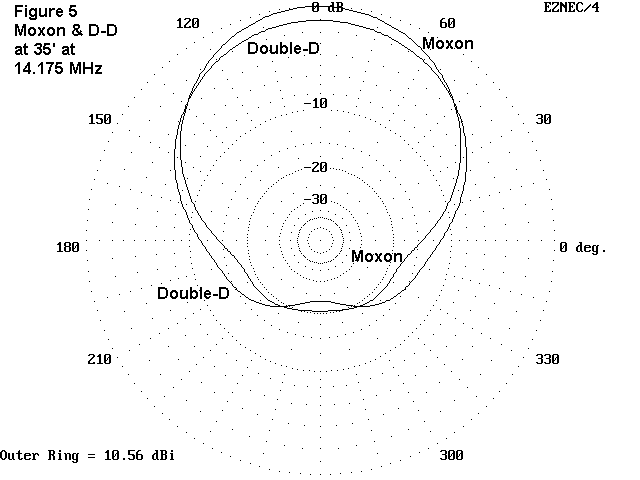 Over level average terrain, at a height of 1/2 wl (about 35' on 20 meters), the antenna exhibits a broad forward lobe and an equally broad rear lobe. The front-to-back ratio increases to about 22 dB, while the forward gain is in the neighborhood of 9.5 dBi. Figure 5 overlays a Moxon and a Double-D pattern for relevant comparison.