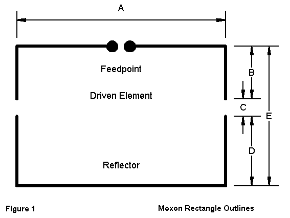 The standard sketch of the Moxon Rectangle used in all of the notes on this antenna appears in Fig. 1.