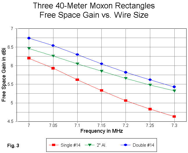 Fig. 3 provides comparative gain curves for the three versions of the antenna. Note that the single #14 wire version has the steepest curve. The 2" aluminum model has the shallowest curve, even shallower than the higher gain double #14 version. This further shows that while a double wire is a useful simulation of a single fat wire, it is not an exact replacement.