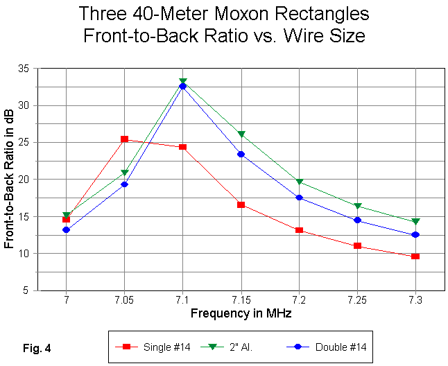 In this case, effective wire thickness has a direct bearing on the broadness of the front-to-back characteristic of the rectangle. The double wire does not quite match the values across that band that are achieved by the aluminum model, but the differences are relatively insignificant. Compared to either "fat-wire" model, the single-wire #14 version is extremely thin--and that takes it toll on the front-to-back ratio-- especially at the upper end of the band. For those with narrower 40-meter windows, the difference might not make any difference at all.