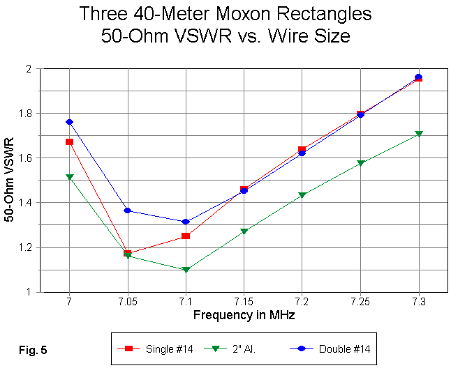 The VSWR curves in Fig. 5 show that any of the antennas would provide a 2:1 operating bandwidth that covers the entire band. Since the single wire center design frequency is below 7.1 MHz, its lowest SWR value does not show. The double-wire version of the antenna was optimized only to the point of providing a 50-Ohm SWR under 2:1 at the band edges. Further tweaking would drop its curve lower, but at no essential gain in any other operating parameter.