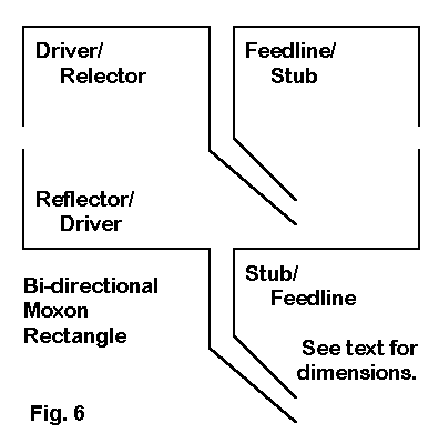 Fig. 6 notes the basic features of a bi-directional Moxon. Each element is cut as a driver and hence are identical. The feedline chosen as the driver line acts as simply another section of the main feedline. The feedline section selected as the reflector line is a stub that electrically loads the element to proper reflector length. Like all of the rectangles in this note, the design frequency was low in the band to provide operating coverage over the full 300 kHz spread. The dimensions of the design considered here are as follows: