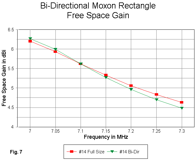 In Fig. 8, we can see the effects of using a loaded reflector. The front- to-back curves of the two antennas are almost perfectly parallel. However, the bi-directional model shows a lower front-to-back ratio, partly due to the closer spacing of the horizontal wires that results from loading and element that is only as long as the normal driven element. To this front-to-back figure, one must add the effects of stub losses, which are not accounted for in the model. The operational difference from the model will be insignificant compared to differences created by the circumstances of installation.