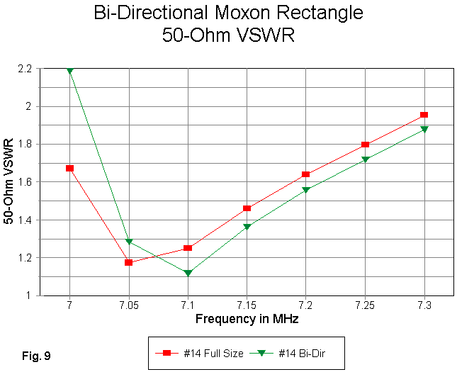 Fig. 9 shows comparative 50-Ohm VSWR curves. With a bit of further dimensional juggling, the curve for the bi-directional model can be brought within 2:1 values for both band edges. However, the curve given is sufficient to note that the bi-directional model displays somewhat sharper tuning than the one-way version. With a load in the reflector element, the reactance tends to increase more rapidly across the band.