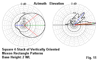 The 4-stack square achieves over 5 dB more gain than a single Moxon at a 2 wavelength base height. However, the front-to-back ratio is mediocre compared to the levels achieved by the strictly vertical stacks. As well we continue to have feedpoint impedances calling for further design efforts to effect in-phase feeding of the entire set of antennas in the array.