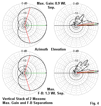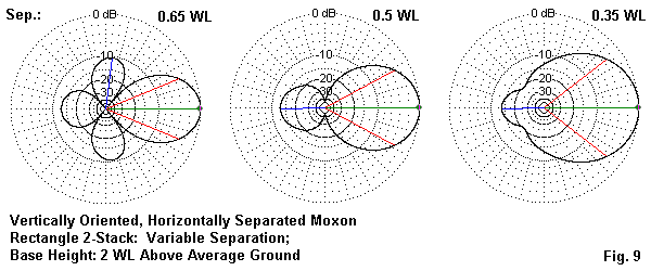 The end result is simply an inability to recommend or dis-recommend a stack of horizontally oriented Moxons. To reach a conclusion in either direction would require a set of operational specifications against which to measure the extremes of either maximum gain or maximum front-to-back ratio--or some intermediate separation yielding the best compromise between the two extremes.