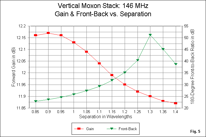 Fig. 5 graphs both the forward gain and the 180-degree front-to-back ratio for the Moxon stack at the 0.05 increments of increasing separation. The graph clearly shows the separate peaks for the two phenomena. However, unless we examine the Y-axis labels carefully, we may make too much of the relative sharp peaks.