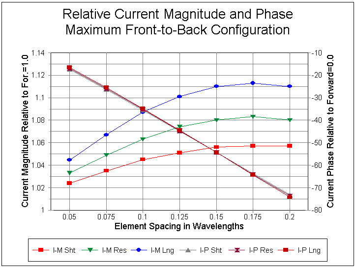 What does change with the length of the elements is the relative current magnitude required on the rear element. The longer the element pair, the higher the required value of relative rear element current to achieve. The differentials for 10% changes in element length are between 2% and 3%.