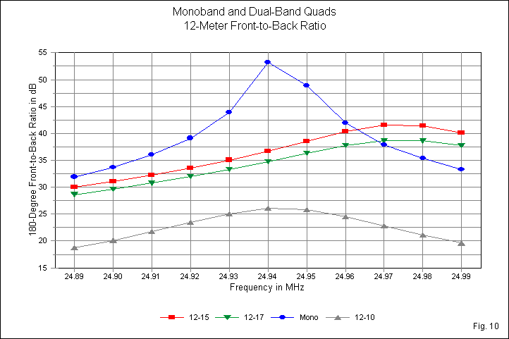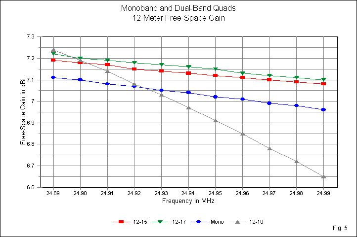 The 12-meter gain curves in Fig. 5 provide us with only 1 case where the 12-meter loops serve as outer elements. The narrow spaced 12-10 combination produces a very steep gain decrease curve, even over the 100 kHz of the band. When the 12-meter elements are inner loops, they show slightly higher gain than the monoband quad. However, the curves for the 2 dual-band quads are too close together for any definitive conclusions regarding relative curve flatness.