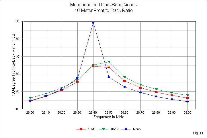 The mis-alignment of the 12-meter monoband curve with the 2 inner-loop cases is not quite accidental. The 10-meter curves appear in Fig. 11. The monoband quad model achieves a very high and steep peak value at the 28.4-MHz design frequency. The 10-12 and 10-15 dual quad pairs have peaks of unknown value near 28.45 MHz. Drawing the peak frnt-to-back ratio downward to the design frequency is a tedious task requiring exceptionally small increments of reflector length change. I have allowed the peak displacement since such tiny changes would be beyond the limits of most home shop facilities. Nevertheless, both inner loop 10-meters element sets show higher band-edge front-to-back values than the monoband quad, if only by a little. As well, the pair with the lower frequency ratio show even more slightly higher band-edge values.