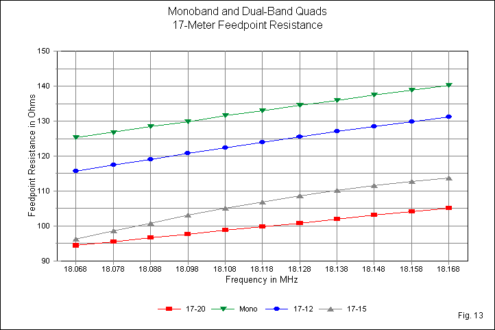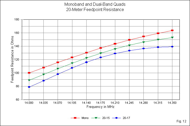 Both dual-quad curves for 20 meters in Fig. 12 represent outer locations relative to the other band involved. Both curves show a systematic decrease in the feedpoint resistance relative to the monoband value. The lower the frequency ratio between the bands, the greater the decrease in feedpoint resistance in the outer loop. As well, the lower frequency ratio produces a less linear curve.