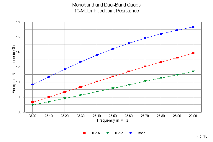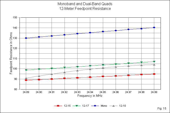 The narrow 12-meter band, shown in Fig. 15, allows us to examine the region of feedpoint resistance near the design frequency. In all cases, the dual-quad resistance is at least 30 Ohms lower than the monoband value. As well, lower frequency ratios produce greater resistance reductions. Near the design frequency, the low-ratio inner loop curve has the lowest resistance. However, the low-ratio outer curves would show (as on 15 meters) a non-linear shape such that wider band edges would show values as low or lower than when the loops form a low-ratio inner element set.