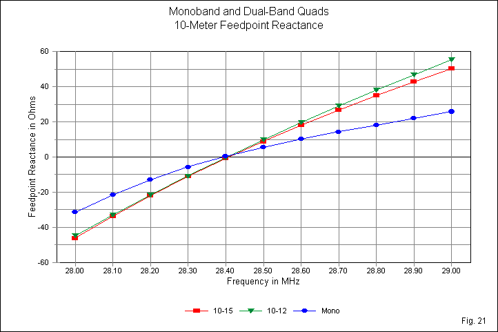 The 10-meter curves in Fig. 21 lose all drama because both dual-quads place the 10-meter elements in inner positions. Hence, the curves are nearly linear with a steeper slope than the monoband curve. The lower frequency ratio curve (10-12) shows a slight, nearly negligible, steeper slope than the higher frequency ratio curve (10-15). In both cases, the 1-MHz passband yields a total reactance change close to 100 Ohms.