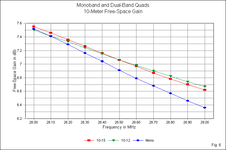 Besides the monoband reference gain curve, the 10-meter dual-quad gain curves in Fig. 6 are limited to cases where the 10-meter elements are inner loops. At 28.4 MHz, both dual-quad curves show a higher gain than the monoband quad. As well, the more widely space 10-15 combination shows a steeper curve than the narrow 10-12-meter pair.