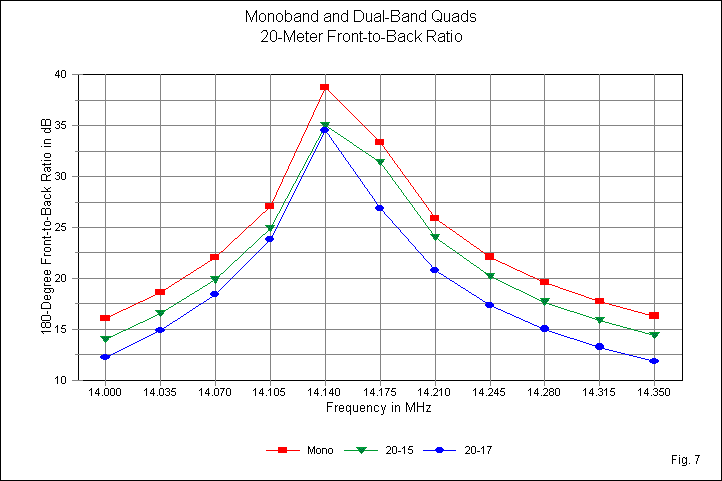 Within the limits of modeling described earlier, the 20-meter front-to-back curves are nearly congruent. The monoband curve shows the highest peak value and the highest band-edge values. The dual-band quads show slightly lower peak values (although that appearance may be illusory, given the narrow-bandwidth of the actual peak). They also show very comparable band-edge value. However, as we decrease the frequency ratio of the 2 bands, the band-edge values decrease. Note that these remarks apply to the 20-meter loops as outer elements in the band pairings.