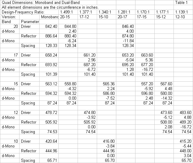 The dual-band quads are listed according to the bands covered, that is, as 20-17, 20-15, etc. Each combination shows the loop circumferences that result in a peak front-to-back ratio and near resonance at the design frequencies. The entries marked "d-Mono" show the difference between the required circumference of the element in its place within the dual-band quad and the corresponding monoband element. A positive value means that the dual-quad element is larger; a negative value means that it is smaller.