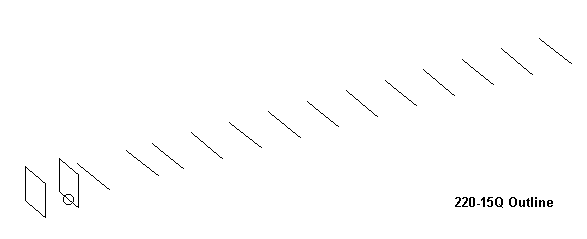 Bill Buchanan, WB4WEN, sent me the design of the array from which the above Yagi was derived. It is a design expressly for 220: a 15 element quagi, as shown in the outline sketch. It has all of the features of the Yagi that I generated for purposes of comparison, except that the driver and the reflector are quad elements. In many cases, quagis show no better performance than comparable Yagis, but in this special case, it does. Remember that directors 2 through 13 are all the same length for construction simplicity. The design shows better than 1 dB gain over the Yagi of the same design, with a few inches saved on the boom, since the quagi reflector and driver can be closer spaced for the 50-Ohm feedpoint match. The gain of the array falls directly between the values for the 14-element and the 16-element DL6WU designs, and the boom length is also between the two. What the uniform elements may give up in maximum gain is restored by the use of quad elements for the driver and reflector.