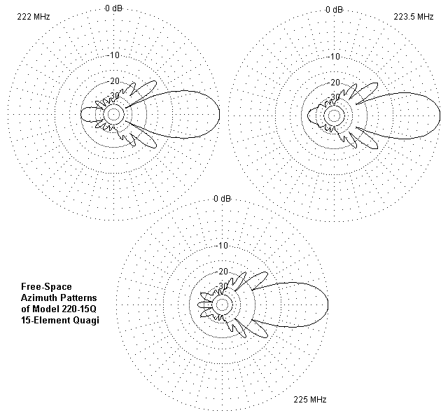 Model 220-15Q Dimensions (in inches): Element Diameter 0.1875" Note: Reflector and Driver dual numbers represent the length of a quad element side and the circumference of the element. Element Length Space from Reflector Reflector 14.53/58.14 ---- Driver 14.00/55.99 13.63 Director 1 22.79 23.60 Director 2 22.11 43.60 Director 3 22.11 54.18 Director 4 22.11 69.93 Director 5 22.11 85.72 Director 6 22.11 101.58 Director 7 22.11 117.37 Director 8 22.11 133.28 Director 9 22.11 149.02 Director 10 22.11 164.82 Director 11 22.11 180.61 Director 12 22.11 196.46 Director 13 22.11 212.20 Modeled Performance Parameter 222 MHz 223.5 MHz 225 MHz Gain dBi 15.82 15.99 16.05 180-deg F-B 20.01 23.63 24.93 -3dB Beamwidth 28.2 27.2 26.2 Impedance (R+/-jX) 61.7 - j 20.1 53.9 - j 9.0 43.6 + j 9.8 50-Ohm SWR 1.51 1.21 1.28