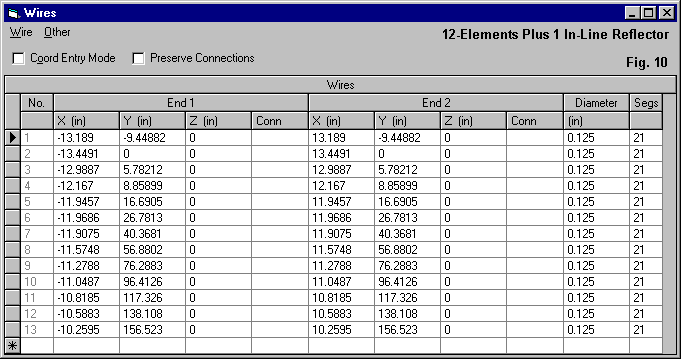 Fig. 2 provides an EZNEC Pro wire table for the original array, with all dimensions in inches. This wire structure, using 1/8" aluminum elements, is the basis for what follows.