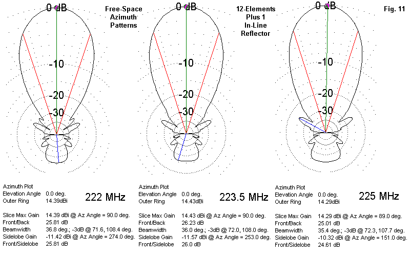 The constant gain increase resulting from placing and optimizing the 2 new reflectors is 0.10 dB. As expected, the gain increase is itself not significant enough to call for the additional two elements. Likewise, the beamwidth does not change at all (0.2 degrees at 225 MHz). Moreover, the forward side lobe performance also fails to change significantly.