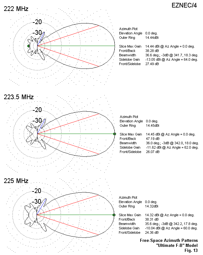Fig. 13 provides sample free-space azimuth (E-plane) patterns for the array at each frequency. Of special note with respect to our project of increasing the front-to-back ratio is the fact that, although we indeed significantly increased the 180-degree front-to-back ratio, we did not improve the worst-case value. In fact, above 222 MHz, the worst-case value actually goes down. However, the total energy to the real remains lower, as may be evident from comparing the rearward quadrants of ULT and REF in their respective azimuth patterns.