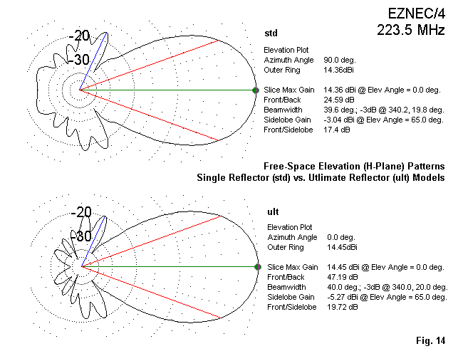 The supplemental reflectors also have a benefit for the free-space elevation (or H-plane) pattern of the array. Fig. 14 shows that benefit.