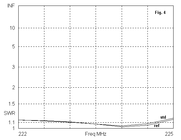 Antenna STD REF Frequency R+/-jX Ohms SWR R+/-jX Ohms SWR 222 47.5 + j 6.1 1.14 49.5 + j 6.8 1.15 223.5 48.9 + j 3.3 1.07 51.2 + j 3.4 1.07 225 43.6 - j 4.2 1.18 45.5 - j 5.3 1.16