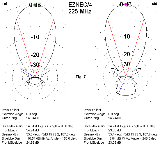 Fig. 7, the comparison at 225 MHz, shows a continuation of the features so far noted. The rear quadrants show considerably less energy in ref than in std, despite an absence of change to the forward lobe structure. One reason--subject to full analysis of a 3-dimensional pattern set--that so little gain is added to the forward lobe is that the original rear lobes initially had so little energy. At well over 20 dB down from the main lobe, a further increase in front-to-back ratio of 10 dB leaves little energy to add to the array's forward gain.