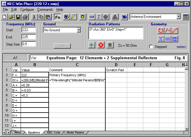 Fig. 8 shows the very simply equations page, with 3 variables, A, B, and C. A is the element half length in meters (the default unit of .NEC-format conversion from EZNEC to NEC-Win). B is the distance along the Y-axis, where a value of zero would align the new reflectors with the old. C is the vertical separation of each reflector above and below the plane of the other elements.