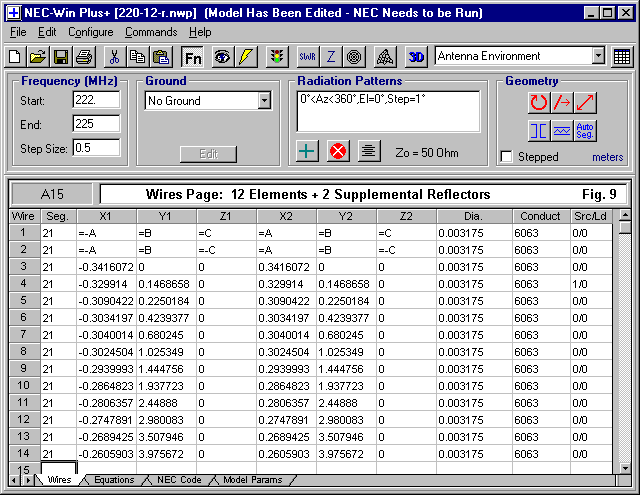 The wires page, Fig. 9, shows the variable placement for the two new elements. The element length coordinates appears as A and -A. Likewise, the upper and lower new reflectors are at C and -C. Note that in this initial exercise, I did not alter the placement of length of the original reflector. In a full scale study, one might wish to convert this element to a set of variables and adjust its specifications. (Since the original reflector was crucial to obtaining the impedance curves across the passband, I left it unchanged as the simplest means of sustaining those curves.)