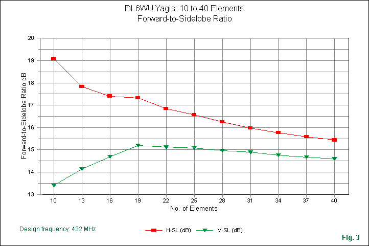 Because the front-to-sidelobe values do not form a consistent curve, we may for reference take their average values. The average horizontal sidelobe ratio is 17.7 dB, while the average vertical sidelobe ratio is 14.7 dB. Of course, in free-space, the notion of horizontal applies to the antenna's E-plane, while the idea of vertical applies to the H-plane, as if the antenna were horizontally polarized over ground. Fig. 3 provides a more detailed graphical look at the front-to-sidelobe ratio values. From 10 to 19 elements (2.1 to 5.6 wavelength booms), the horizontal and vertical sidelobe ratios almost form inverse curves. However, above 19 elements, both curves show a decreasing front-to-sidelobe ratio.