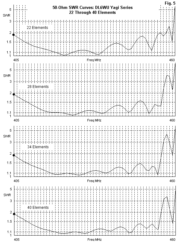 Fig. 5 shows the SWR curvers for Yagis with 22 through 40 elements. The ratio of the longest boom to the shortest in this set is similar to the boomlength ratio for the first 4 Yagis in the set. However, the entire set shows only 6 or 7 dips, depending upon boom length. Still, the set of curves does show clearly the gradual compression of passband space between dips and the development of a new lower-end dip.