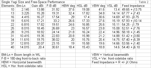 The DL6WU series of Yagis becomes ever more stable in performance as we increase the boomlength and the number of elements. Table 2 supplies the free-space performance values for the set of trial designs, and includes values for both the vertical and horizontal beamwidths and sidelobe ratios. The beamwidth values will become significant later when we compare the calculated stacking spacing values to the modeled values. The front-to-sidelobe ratio is the differential between the main forward pattern lobe and the strongest forward sidelobe.
