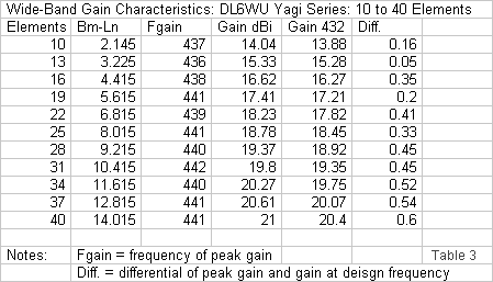 All DL6WU designs used in this study emerge from the program dl6wu-gg.exe. As noted in the 2-meter study, we only need a single set of dimensions, the ones for the longest version of the beam series. In this case, the limit is 40 elements. Table 1 presents those dimensions for an element diameter of 4 mm. The dimensions appear in millimeters, inches, and wavelengths.