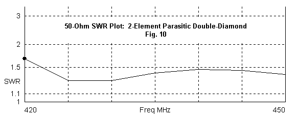 However, the ratio of length to height of each loop has decreased to about 1.40:1 to achieve a 50-Ohm resistive resonant impedance. From this point forward, we shall use our 1/4" (6.35-mm) elements for further models. The 420-450-MHz 50-Ohm SWR plot in Fig. 7 shows that the double-diamond is--like the single side-fed loop--a wide-band antenna.
